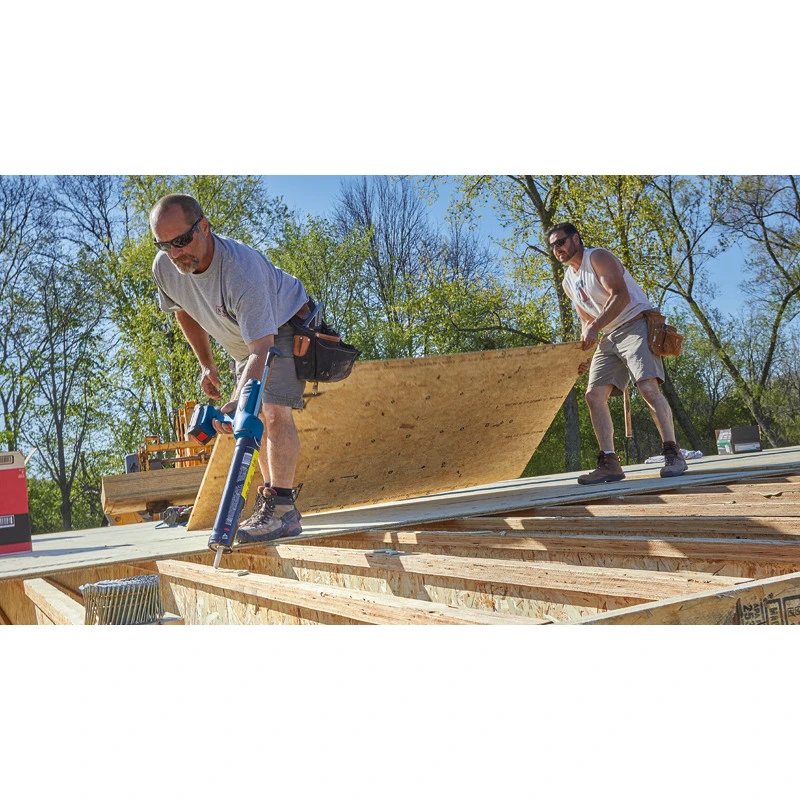 The Bosch GCG18V-29 18V Caulk and Adhesive Gun provides powered caulking to reduce the fatigue on your hand from manual caulk and adhesive guns. It has speed selection and a variable-speed trigger for a consistent bead size and easier caulk application. The caulk and adhesive gun features an auto-reverse feature on the plunger rod to help prevent dripping and material overflow. It holds 29 oz. tubes and delivers a no-load max of 18 n. per minute feed and 790 lbs. of push force, to push even high-viscosity adhesives including anchor adhesives in concrete. The cage rotates, so that material can be applied in difficult areas while still keeping your preferred hand location. And itβs light only 5 lbs. (tool only, not including battery). It is compatible with Bosch 18V Lithium-Ion batteries, and it fits 29 oz. tubes. The caulk gun has a hook for hanging between jobs and a lockout switch, to the trigger wonβt be accidentally activated.